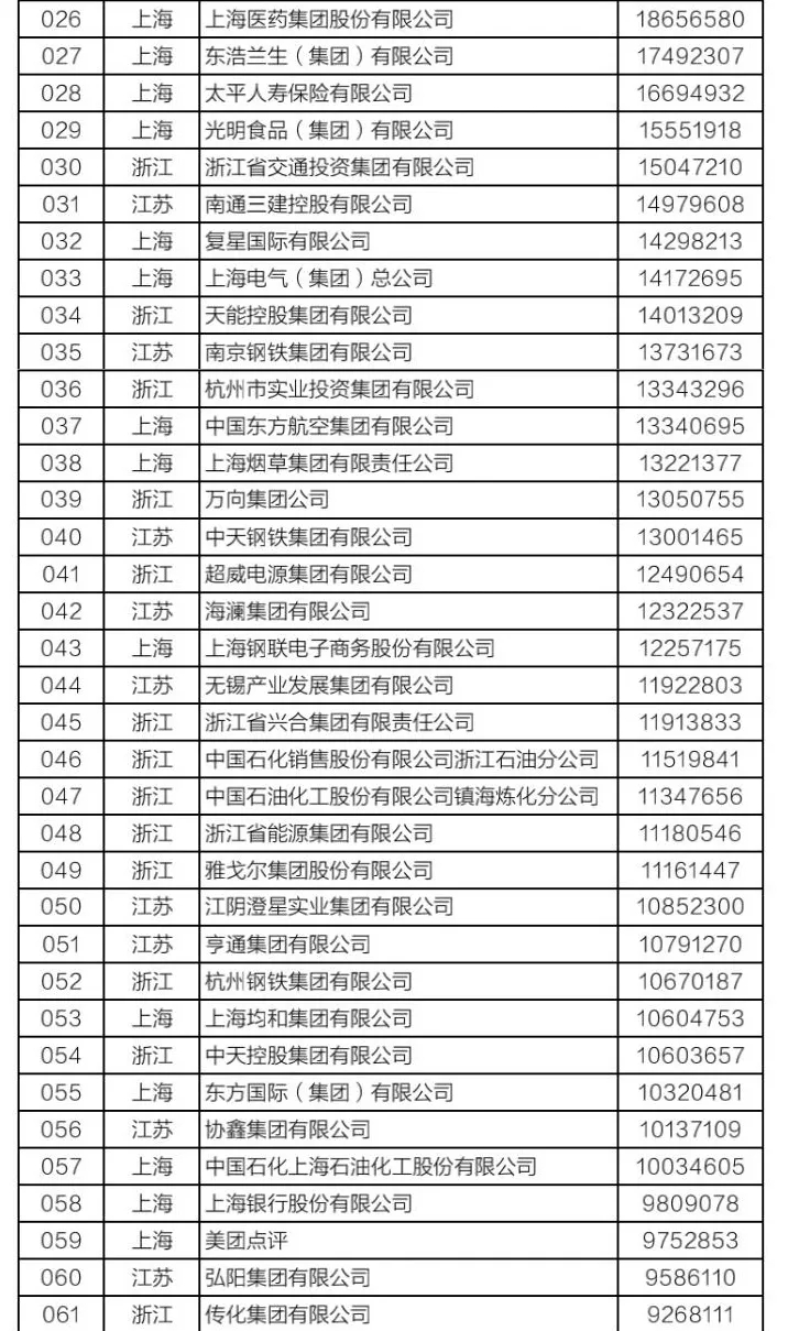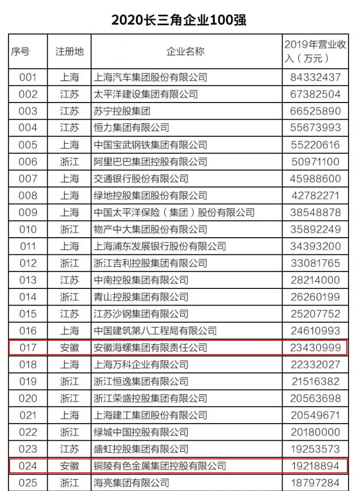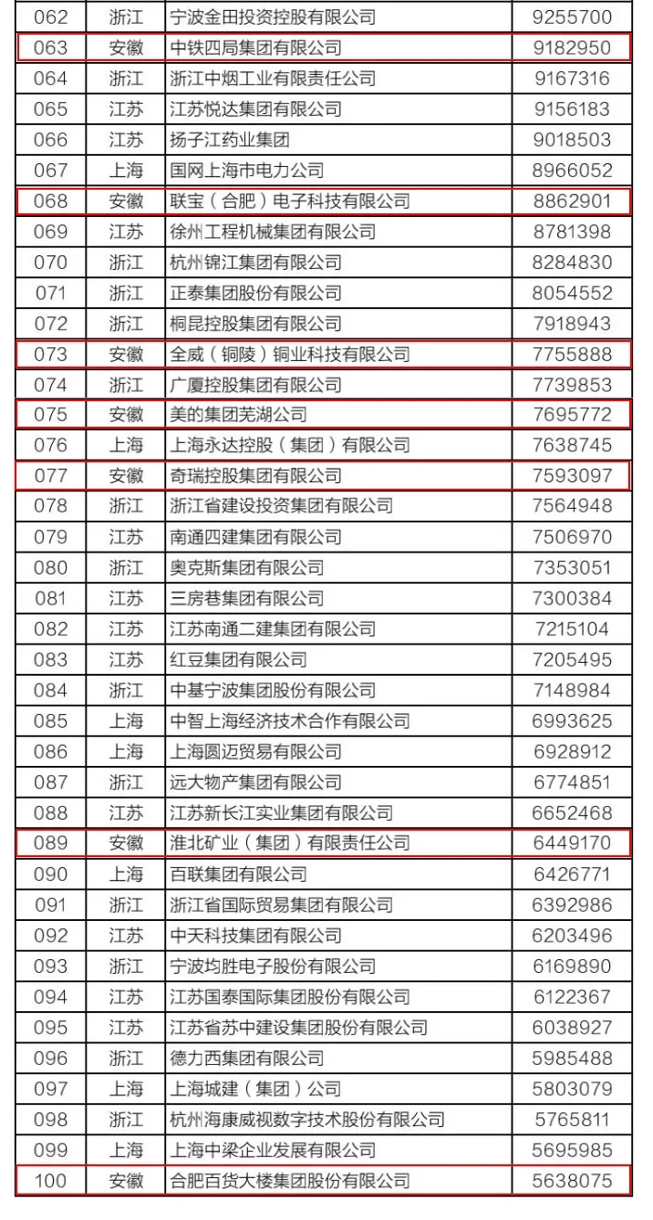該榜單以2019年企業(yè)營(yíng)業(yè)收入為入圍標(biāo)準(zhǔn),由長(zhǎng)三角三省一市企業(yè)聯(lián)合會(huì)共同發(fā)布。今年是第二次發(fā)布長(zhǎng)三角企業(yè)百?gòu)?qiáng)排行榜,入圍門檻是563.8億元,比上年提高了54.5億元。今年我省共有9家企業(yè)上榜,除淮北礦業(yè)集團(tuán)外,其他8家企業(yè)為海螺集團(tuán)、銅陵有色、中鐵四局、聯(lián)寶(合肥)電子、全威(銅陵)銅業(yè)、美的集團(tuán)蕪湖公司、奇瑞控股集團(tuán)和合肥百大,主要分布在水泥建材、有色金屬、汽車制造、煤炭和煤化工等行業(yè)。