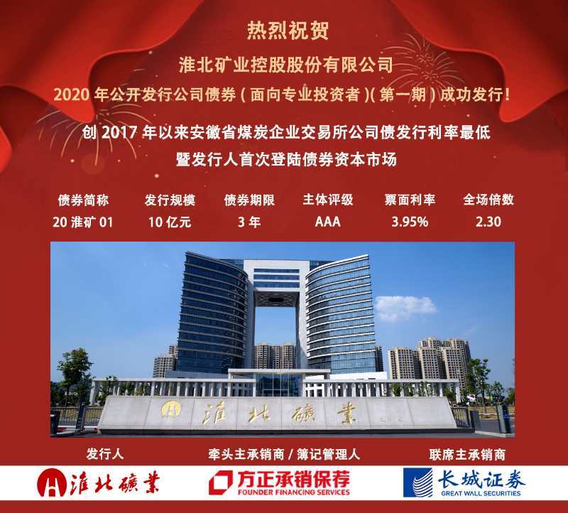 10月20日,淮北礦業(yè)2020年公開發(fā)行公司債(面向專業(yè)投資者)(第一期)成功發(fā)行,本期債券發(fā)行規(guī)模10億元,期限3年,票面利率3.95%,認購倍數2.3倍。