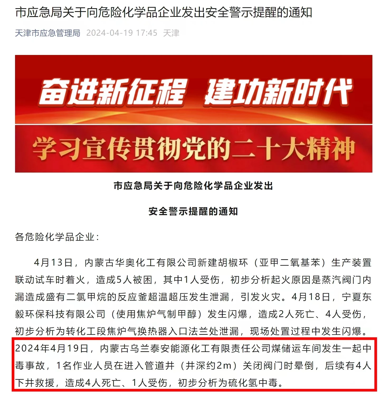 日前,天津市應(yīng)急管理局向危險(xiǎn)化學(xué)品企業(yè)發(fā)出的一則安全警示通知提到,4月19日,內(nèi)蒙古烏蘭泰安能源化工有限責(zé)任公司煤儲(chǔ)運(yùn)車(chē)間發(fā)生一起中毒事故,1名作業(yè)人員在進(jìn)入管道井關(guān)閉閥門(mén)時(shí)暈倒,后續(xù)有4人下井救援。事故共造成4人死亡、1人受傷,初步分析為硫化氫中毒。